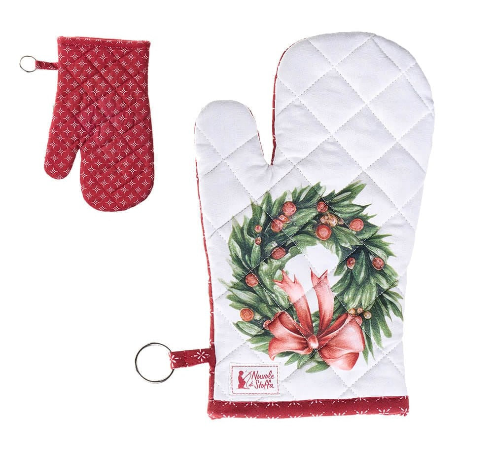 Guantone bianco con ghirlanda natalizia, retro rosso con disegni geometrici bianchi