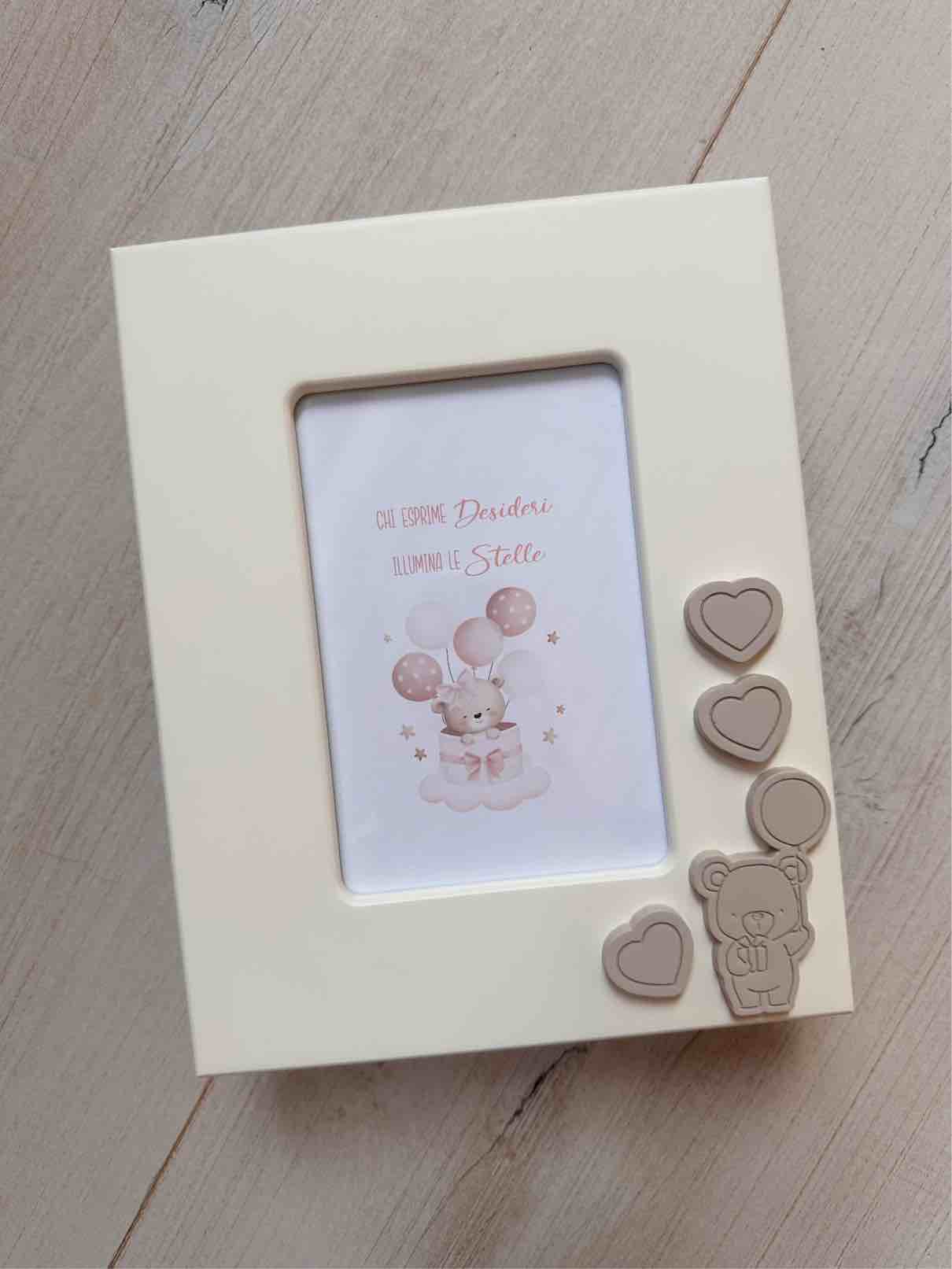 Portafoto in legno laccato bianco orsetto e cuoricini in polvere ceramica colorata