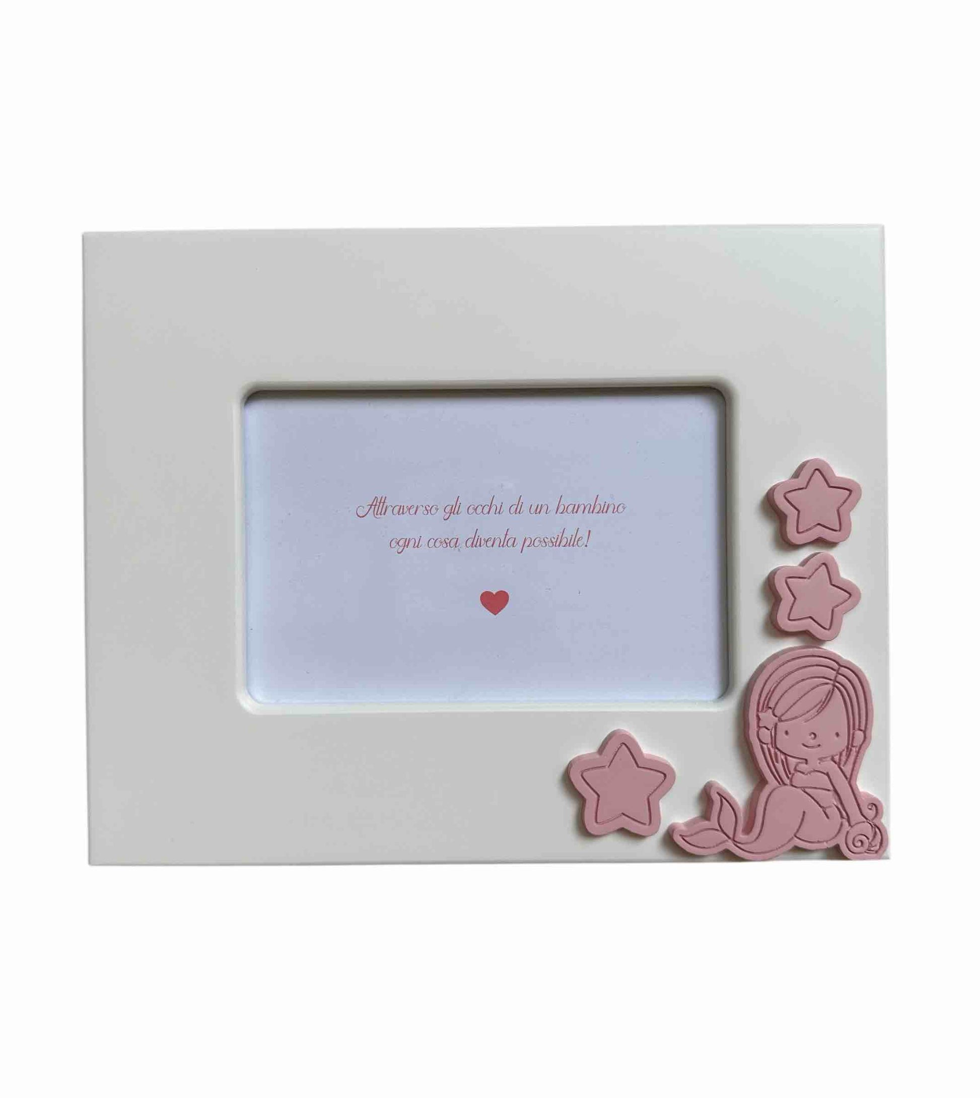 Portafoto in legno laccato bianco con sirenetta e stelline in polvere ceramica colorata