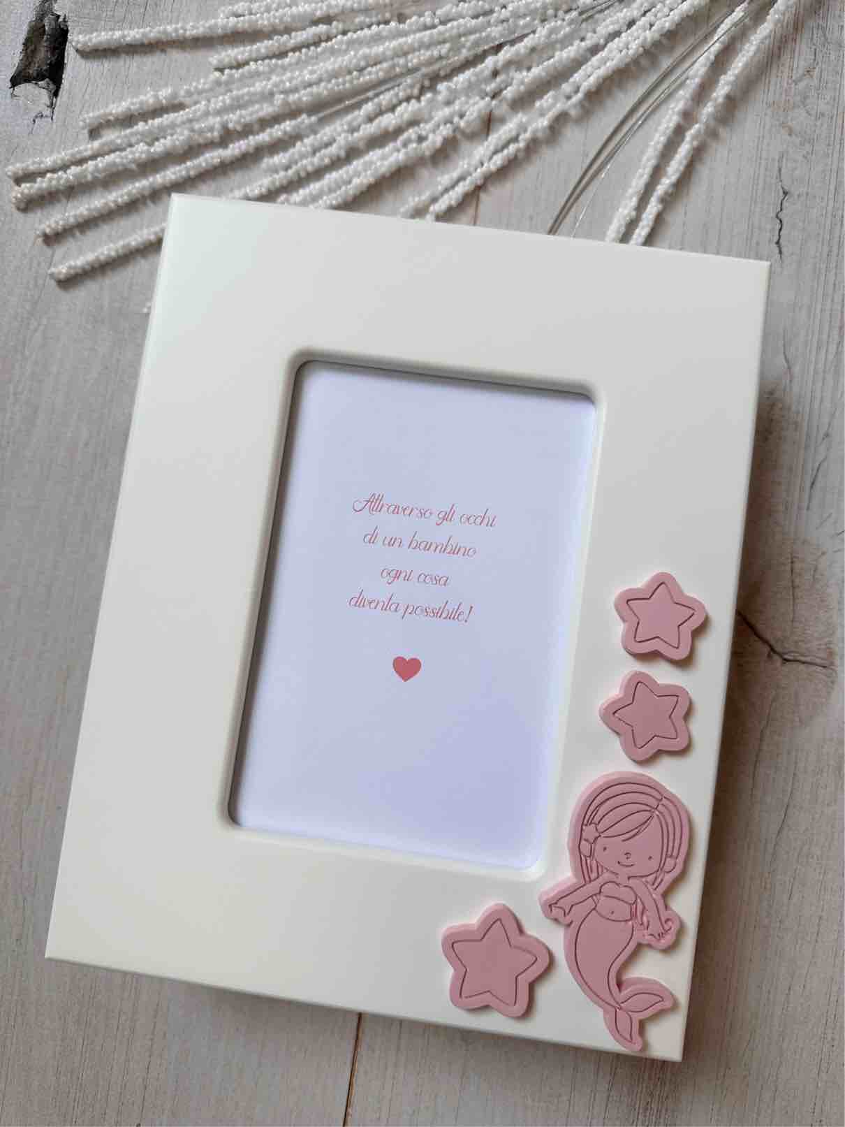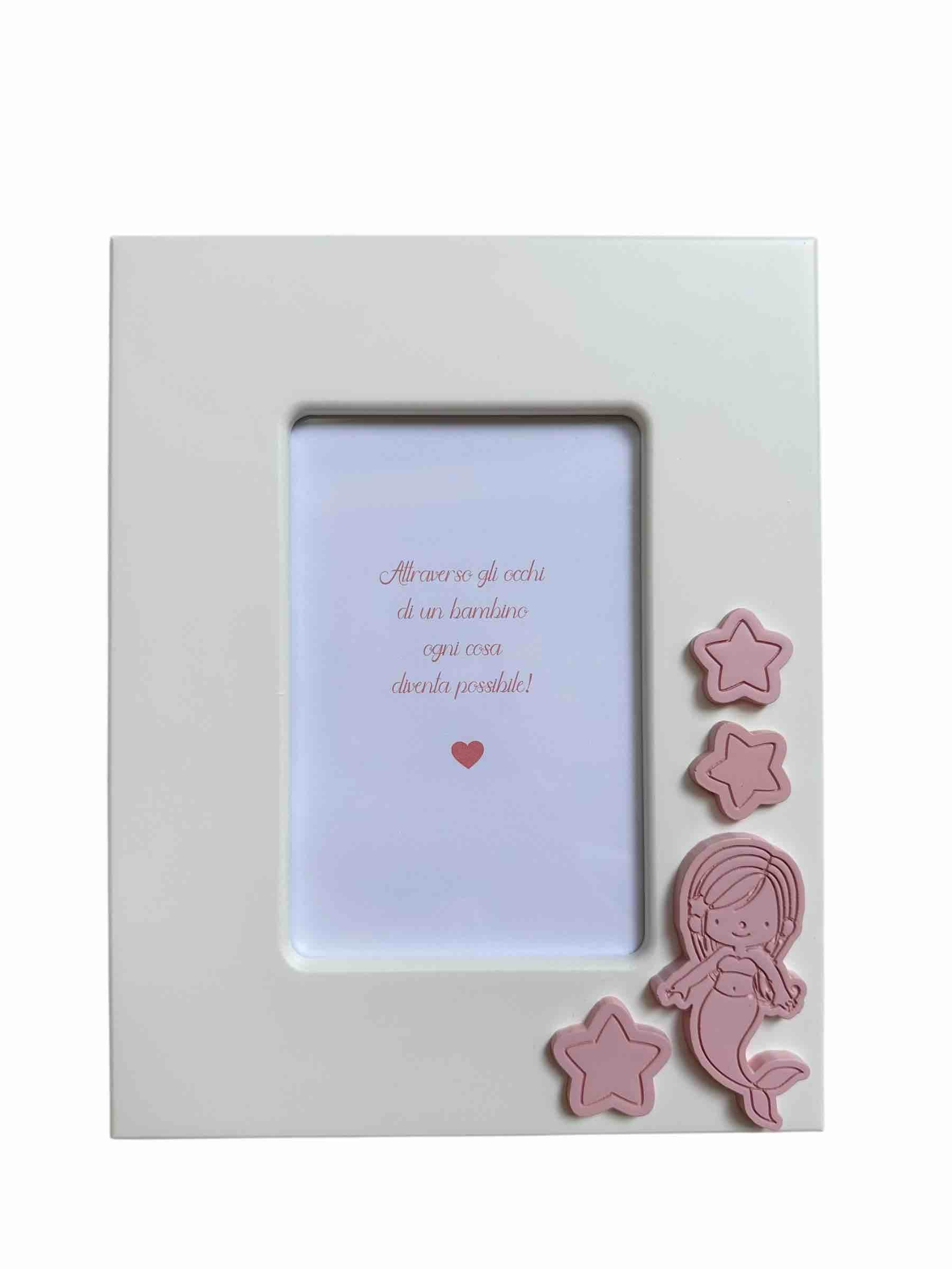 Portafoto in legno laccato bianco con sirenetta e stelline in polvere ceramica colorata