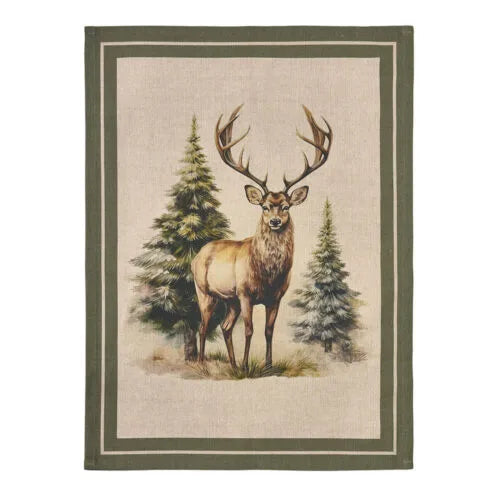 Strofinaccio in cotone dai toni invernali con stampa cervo tra gli abeti.
